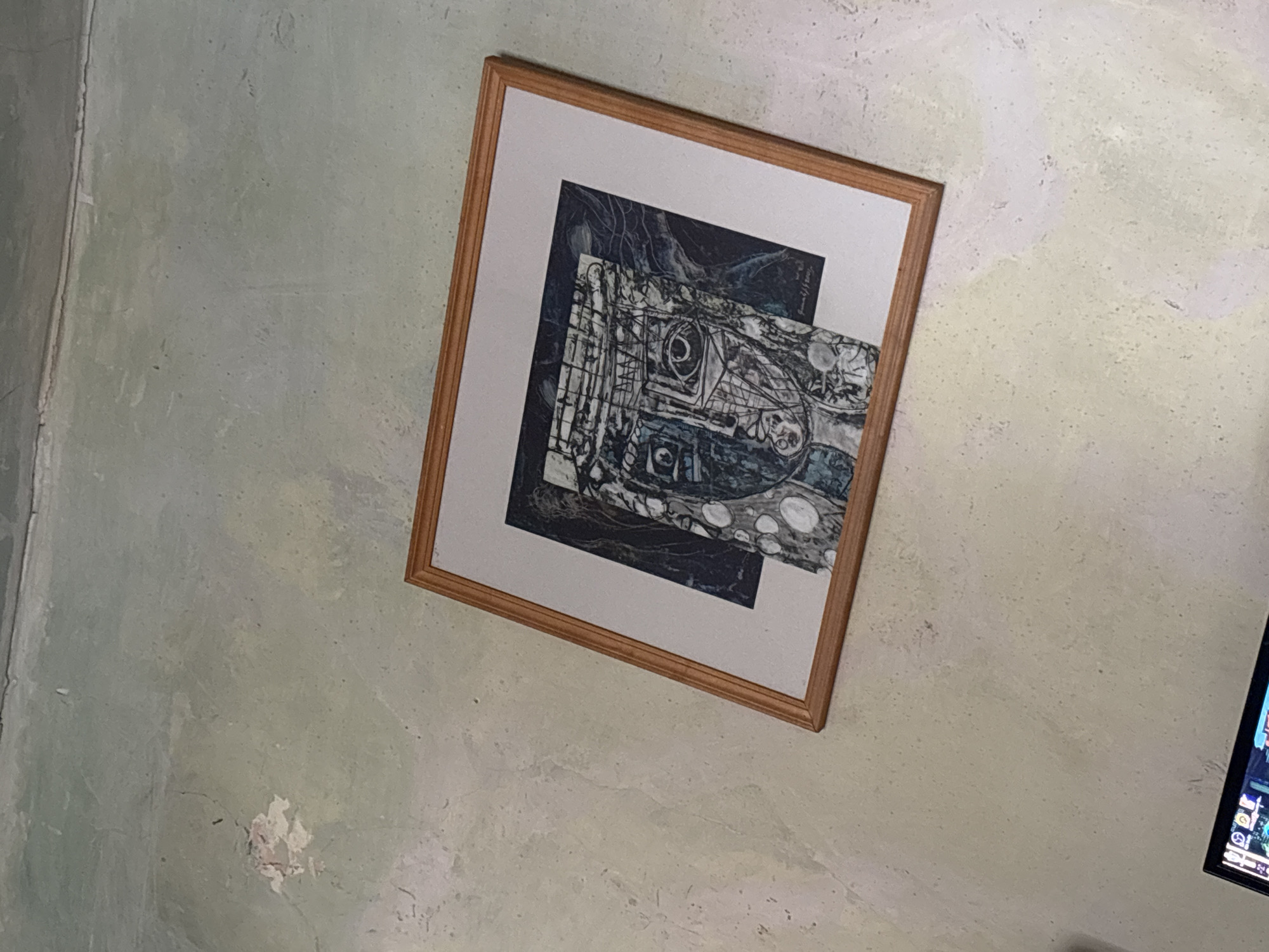 A framed artwork hangs on a light green wall. The artwork features abstract black and white drawings and patterns. To the right of the artwork, a black television screen is partially visible. The wall has a textured surface and some areas of damage. The location is Unknown, Unknown.