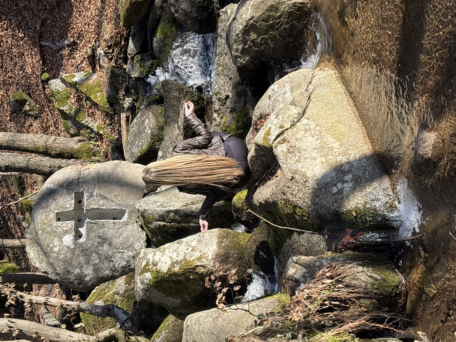 A single individual is seated on a large, moss-covered rock in a rocky stream environment located near Kladnitsa, Bulgaria. The person, viewed from the back, has long, straight blonde hair and wears a dark leather jacket over black leggings. Her arms are extended outwards with palms facing upwards. Directly in front of her, centrally positioned, is a large grey boulder featuring a deeply carved cross symbol. Numerous other grey rocks, many partially covered with green moss, line the banks and bed of a shallow, clear stream that flows through the scene, creating small cascades. The background reveals bare tree trunks and branches of a deciduous forest, with the ground covered by fallen brown leaves. Sunlight illuminates the scene, casting distinct shadows on the rocks and water.