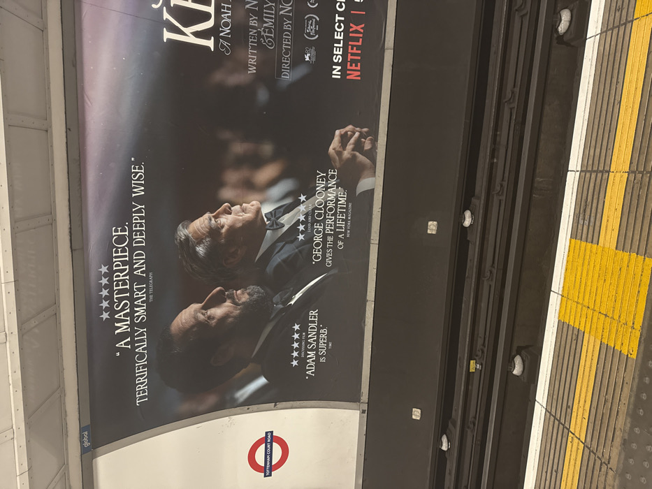 This image depicts an underground railway platform at Tottenham Court Road station in London, United Kingdom. The central focus is a large advertisement poster featuring two men in formal attire, both in profile, looking towards the right side of the frame. The man on the left has a beard and is identified by text as "Adam Sandler," with an accompanying quote "Adam Sandler is superb." attributed to "Time." The man on the right has graying hair and is identified as "George Clooney," with the quote "George Clooney gives the performance of a lifetime." attributed to "New York Magazine." Above the figures, prominent text states, "A MASTERPIECE. TERRIFICALLY SMART AND DEEPLY WISE." attributed to "The Telegraph." To the right of the actors, partially visible text includes a large "K" (likely the start of a title), "A NOAH" (part of a name), "WRITTEN BY N..." and "EMILY...", and "DIRECTED BY N...". At the bottom right, "IN SELECT C..." and the "NETFLIX" logo are visible, indicating streaming availability. To the far left of the poster, a white vertical band contains the iconic red and blue circular London Underground roundel, clearly displaying "TOTTENHAM COURT ROAD." Below the advertisement, a dark panel runs horizontally, followed by multiple railway tracks. White cylindrical insulators or covers are visible at intervals on or near the tracks. The platform edge in the immediate foreground features a yellow tactile strip, with the platform surface appearing dark gray. The entire scene is brightly lit, typical of an underground station environment.