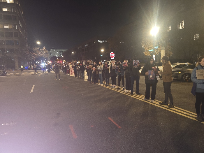 A line of people stand in the street at night, holding photos and signs. A stop sign is visible. Buildings flank the street, and streetlights illuminate the scene. Police vehicles are visible in the distance. The protesters stand between double yellow lines marking a lane. Some hold candles.