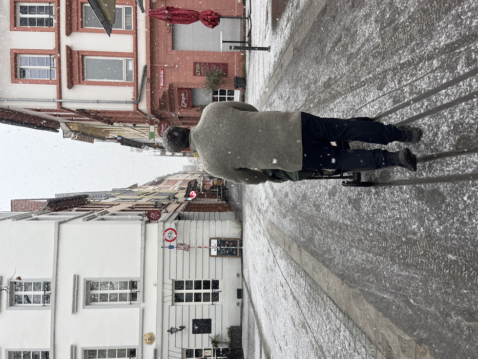 The image depicts a winter street scene in Mainz, Germany, specifically at the intersection of Weintorstraße and Löhrstraße, with the "Weintorstraße" sign visible on the red building to the right. Light snow is actively falling, coating the street and rooftops with a thin layer of white. In the foreground, a single individual, appearing male, is viewed from behind, walking away from the camera and pushing a dark-colored stroller with a visible green fabric element. The person wears a grey, textured long-sleeved sweater, dark trousers, and dark shoes. The street surface consists of paving stones, with darker, parallel grooves or tracks running down the center, partially covered by snow. To the left, a multi-story building with a white facade features multiple vertically oriented windows with grey frames. A decorative golden crest is mounted on the wall above the ground floor. Near the corner, a dark outdoor menu board is positioned next to street signs, including a red circle with a horizontal white bar and a bicycle prohibition sign. To the right, a building with a reddish-pink ground floor and lighter upper stories is visible. The lower section prominently displays the name "L'Angolo." Its main entrance is secured by a closed metal roller shutter. Outside this building, two folded red umbrellas are secured to posts next to small round tables. The street recedes into the distance, lined by additional multi-story buildings with varying architectural styles and colors under a light, overcast sky.