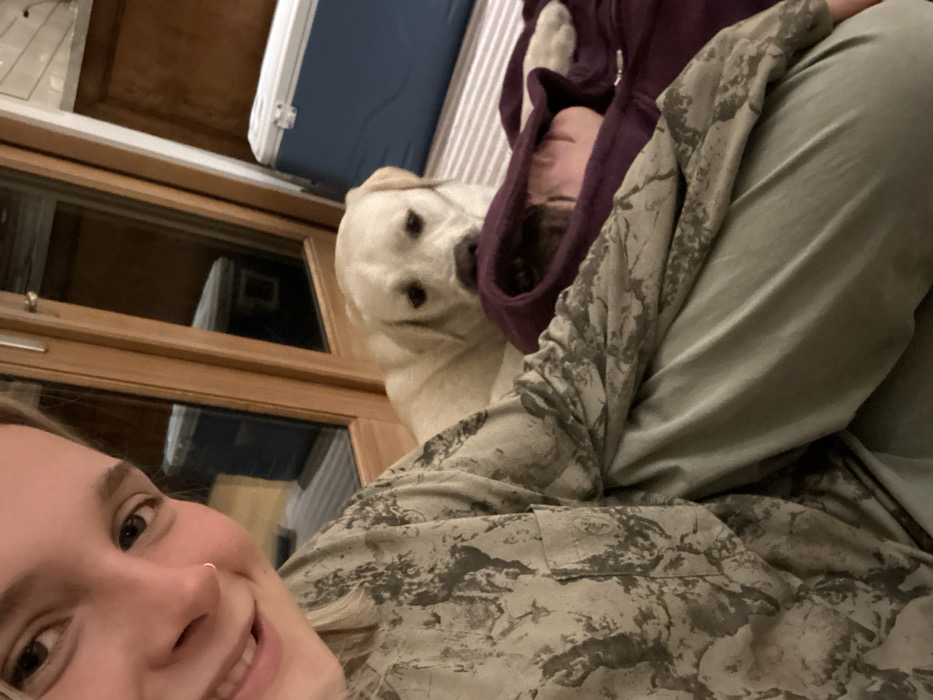 The image depicts an indoor scene in Squamish, Canada, featuring two individuals and a cream-colored Labrador Retriever. In the foreground, on the left, a fair-skinned individual with blonde hair and a silver nose ring is partially visible, smiling directly at the camera. This individual wears a long-sleeved shirt with a mottled camouflage-like pattern and light green fabric covering their lower body. To the right, another individual is lying down, mostly obscured, with their head resting within the hood of a dark purple hooded sweatshirt, appearing to be asleep or resting. The Labrador Retriever is positioned between the two individuals, lying down with its head near the second individual's head, gazing towards the camera. In the background, a wooden-framed door or window with glass panels is visible, showing a faint reflection of an object. To the right of this frame, a large blue and white cooler rests on a light-colored striped surface that extends beneath the second individual. The lighting appears warm, indicating an indoor, possibly residential, setting.
