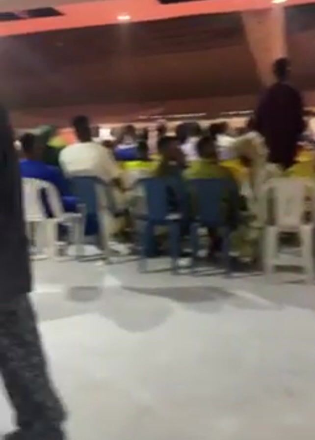 The video depicts a crowded room with numerous people seated in chairs. The individuals appear to be diverse in their attire. Some are standing, while others are walking around. The room has a high ceiling with intricate lighting fixtures. The floor is a light gray color. The overall atmosphere suggests a social gathering or event.