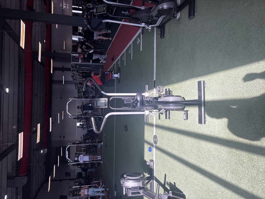 A gym interior with equipment arranged in rows on a green floor. People exercise on various machines. Sunlight streams in, casting shadows across the floor. A red-carpeted area is marked with white numbers, possibly for distance tracking. Weight racks are visible, and lighting fixtures line the ceiling. Exercise bikes and other fitness machines fill the space.