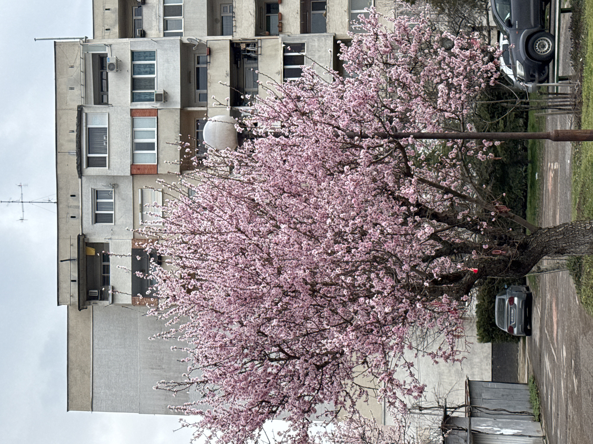 The image depicts an urban outdoor scene in Sofia, Bulgaria, characterized by an overcast sky and early spring foliage. The central feature is a large deciduous tree in full bloom, covered in dense clusters of light pink flowers. Several red and white braided string ornaments (martenitsas) are visible hanging from its branches. In the background, a multi-story, concrete residential building, typical of Soviet-era construction, occupies the upper half of the frame. The building features numerous windows of varying sizes, some with external blinds, and multiple balconies. Several balconies are enclosed, while others are open, displaying items such as air conditioning units. A yellow fabric item hangs from one upper-level open balcony. An antenna structure is visible on the roofline against the grey sky. In the midground, to the right of the blooming tree, stands a dark brown metal street lamp with a spherical white light fixture. A paved area, likely asphalt, extends across the lower portion of the image. Parked vehicles are present: a grey BMW sedan (license plate "CB 3055 TT") is partially visible to the left, behind the tree's trunk, and a dark grey pickup truck is parked further right, partially obscured by the tree and streetlamp. A small, corrugated metal shed or garage is visible on the far left. Green bushes are situated behind the grey sedan. A segment of a light-colored bench is discernible in the lower right corner, partially hidden by the streetlamp. The ground consists of bare earth and sparse grass in the immediate foreground.