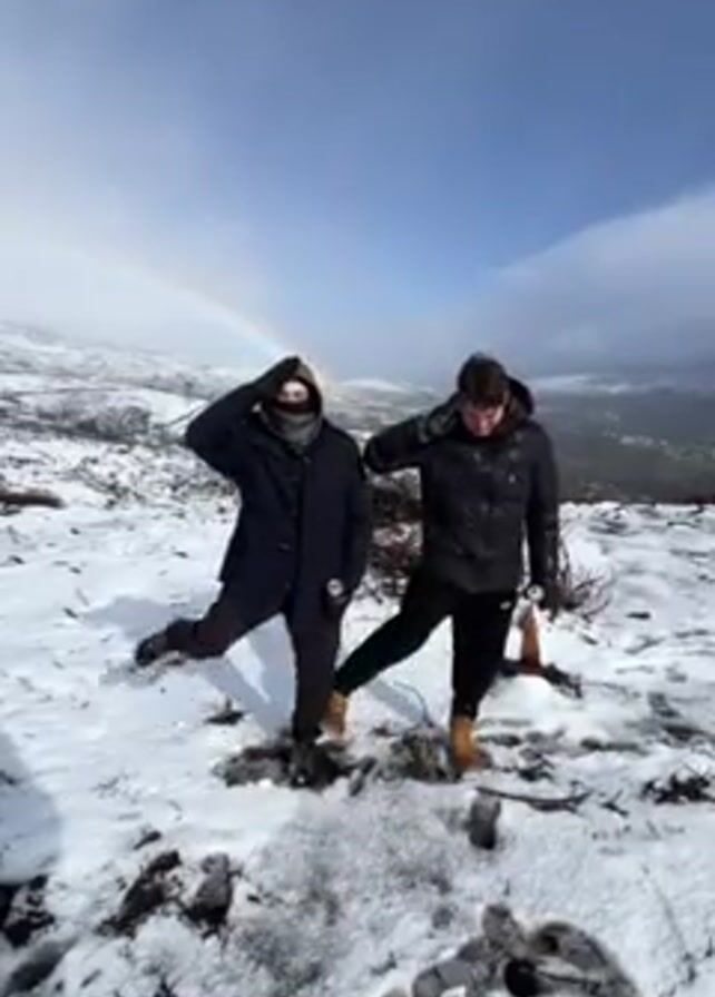 Two people stand on a snowy hilltop under a partly cloudy sky with a rainbow visible in the distance. The person on the left wears a dark coat, brown pants, a dark scarf covering their lower face, and dark shoes. They hold a beverage can in their left hand. The person on the right wears a black puffer jacket, black pants, and tan work boots. They initially hold their right hand to their head in a salute-like gesture, then lower it. The ground is covered in snow with patches of bare earth and small branches visible. Footprints are visible in the snow in the foreground.