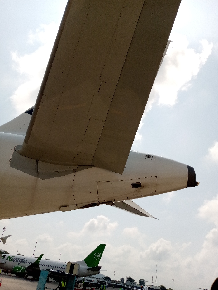 The image displays an airport tarmac scene, viewed from beneath the wing and fuselage of a parked aircraft. The upper portion of the frame is dominated by the light tan underside of an aircraft wing, exhibiting rows of rivets and panel lines. Below the wing, the white fuselage of the same aircraft is visible, featuring dark vents, access panels, and a small, white horizontal stabilizer extending outwards. In the mid-ground, on the tarmac, a white-bodied aircraft with a green tail fin displaying a white circular logo is parked. The words "Green Africa" are partially visible on its fuselage. Surrounding this aircraft are various pieces of ground support equipment, including what appears to be a mobile boarding ramp or baggage conveyor. Several airport ground personnel, dressed in yellow or green high-visibility vests, are present on the tarmac. Orange safety cones are positioned near the equipment. The background shows additional aircraft parked further in the distance, alongside airport infrastructure such as light poles, under a partly cloudy sky with scattered white clouds. The scene is located at an airport tarmac in Gwaska, Nigeria.