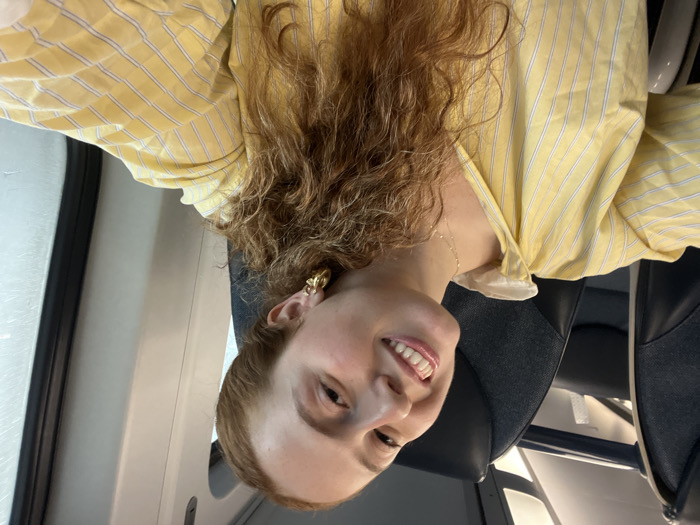 The image depicts a female subject in the foreground, likely taking a selfie, inside what appears to be a passenger train or bus. The subject has fair skin, reddish-brown curly hair extending over her shoulders, and is smiling directly at the camera, revealing her teeth. She is wearing a yellow collared shirt with thin white vertical stripes. A delicate gold chain necklace is visible around her neck, and a gold-toned, somewhat chunky hoop earring is on her visible right ear. In the background, dark grey/black upholstered seats of a vehicle are visible, along with a white overhead panel and a vertical window frame on the right side of the frame. The specific location within Harrison, United States, cannot be determined from the provided image.