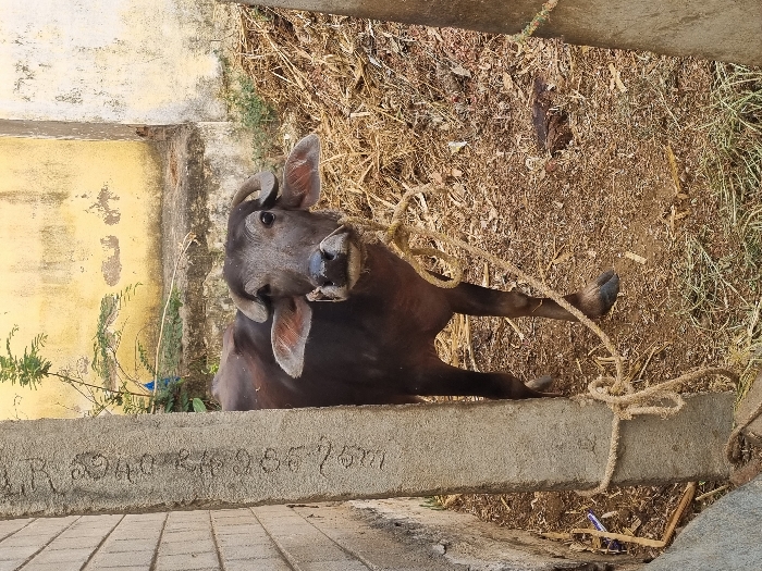 A dark brown water buffalo calf is depicted in a semi-enclosed outdoor area in Kammavaripalli, India