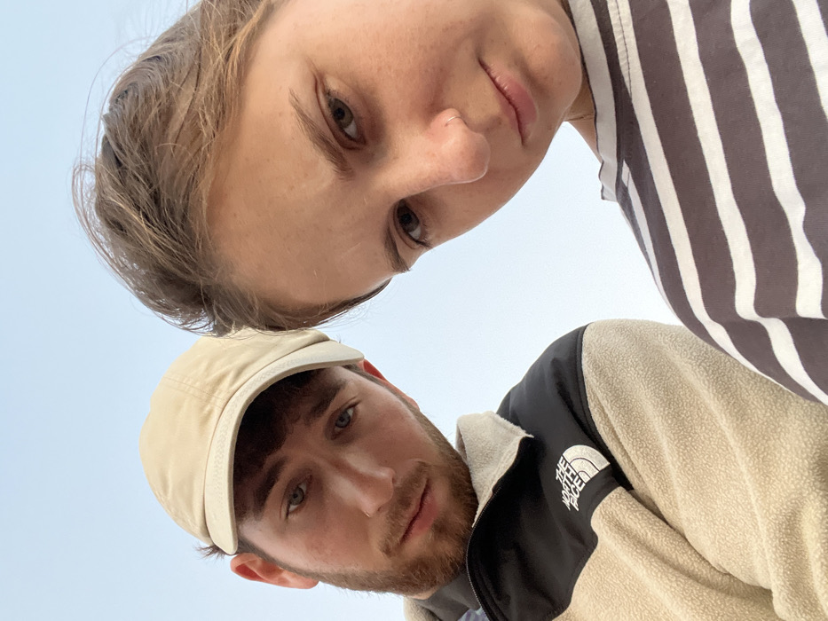 This close-up, low-angle photograph features two young adults against a uniformly light blue sky