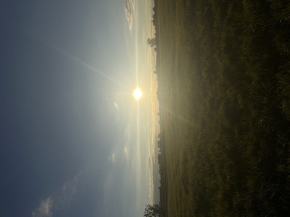 The image displays an expansive, flat agricultural field in Hœrdt, France, under a low sun. The sun is a brilliant white-yellow sphere, positioned in the upper right quadrant of the frame, emitting strong lens flare horizontally and diagonally across the scene. The sky transitions from a deep blue overhead to a lighter, golden-blue near the horizon, with sparse, wispy cloud formations visible, primarily in the upper left. The foreground and midground are covered by green grass, heavily illuminated by the low sun, resulting in bright yellow-green highlights and darker, shadowed emerald tones. A prominent, leafless or sparsely foliated tree stands as a dark silhouette against the brighter horizon on the far left. Along the distant horizon, a subtle line of trees and indistinct architectural structures is visible, partially obscured by atmospheric haze and sunlight. On the far right, a distinct dark silhouette, consistent with a church steeple or tall tower, rises above the distant treeline. No individuals or discernible actions are present.