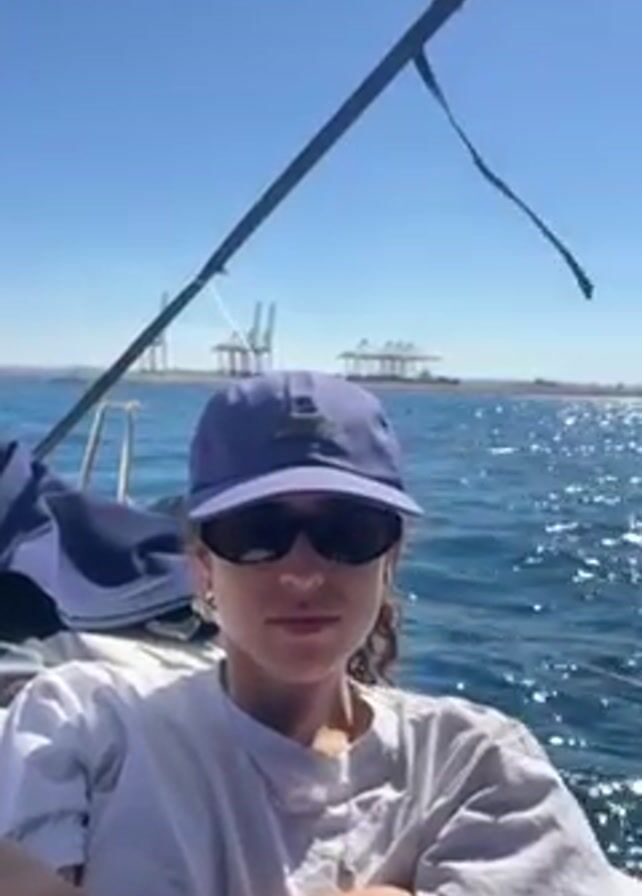 A person on a sailboat is looking toward the camera on a sunny day. In the distance, there are cranes on the shore. The boat is moving through the water.