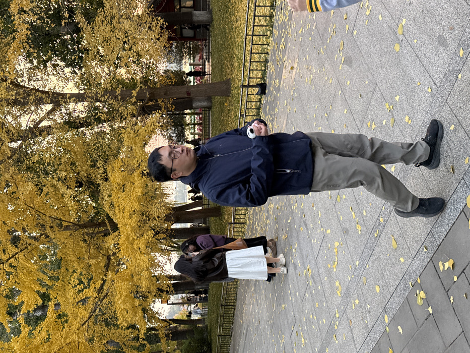 An outdoor scene in Xicheng District, China, depicts a paved pathway in autumn, heavily accented by multiple Ginkgo biloba trees exhibiting bright yellow foliage. The pathway is light grey and scattered with fallen yellow ginkgo leaves. A male individual, East Asian, appearing to be in his 30s or 40s, stands in the foreground, facing slightly right of the viewer. He wears black-rimmed glasses, a dark blue hooded zip-up jacket, light olive-green pants, and black athletic shoes. He holds a small white and black object, resembling a panda-themed item, in both hands at chest height. His expression is neutral. To the left and slightly behind the primary subject, three female individuals are positioned on the pathway. One female with long dark hair wears a dark jacket over a white skirt. Another female wears a purple long-sleeved top and carries a brown shoulder bag. A low, dark metal fence runs parallel to the pathway, separating it from a grassy area also covered with fallen yellow leaves. In the background, beyond the trees and grass, a body of water is visible, likely a lake or pond, with indistinct figures on its far bank. A small structure with a reddish roof is partially visible on the right side of the background. The scene is illuminated by natural, ambient light.