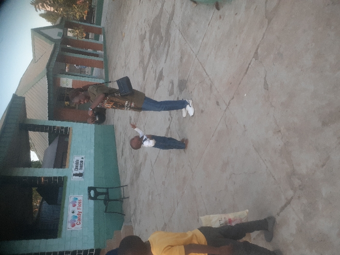 n outdoor scene at Jos Wildlife Park in Jos, Nigeria. In the foreground, a woman stands on the right, wearing a dark green t-shirt, blue jeans, and white sneakers, holding a dark object, likely a camera or phone, aimed downwards. A small child in blue denim overalls and a white long-sleeved shirt stands directly in front of her, looking up and pointing with his right hand. To the far left, partially visible, another child wears a yellow t-shirt and dark pants, holding a white bag. The ground is concrete pavement with visible cracks. In the background, a single-story building with a multi-pitched green roof, light blue and brown painted walls, and exposed dark brickwork features two signs: "Candy Floss" with colorful balloon graphics and "Chocolate Fountain" with a graphic of a fountain. A black chair is positioned against the building wall. Additional structures and trees are visible further in the background under a clear sky.