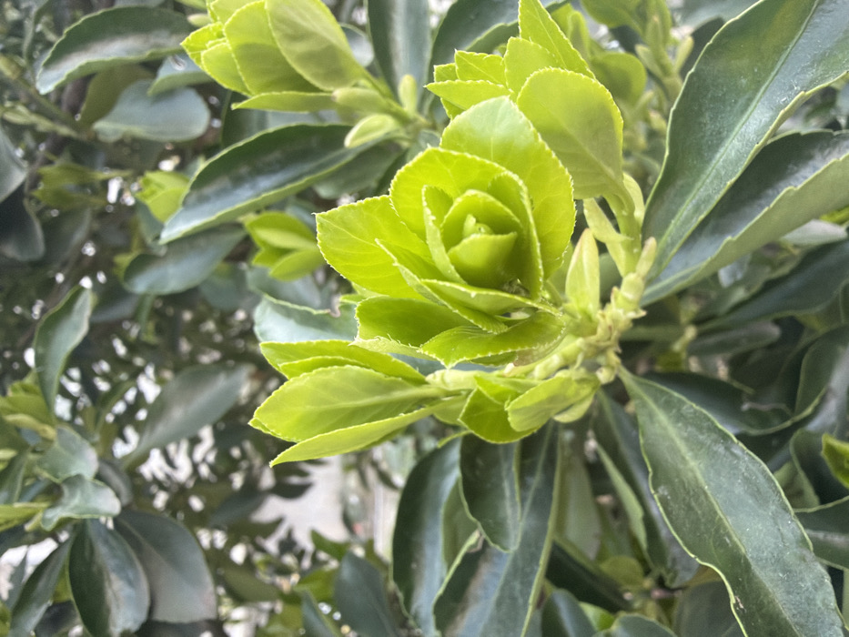 The image displays a detailed, close-up view of plant foliage, situated in Plovdiv, Bulgaria. The central subject is a cluster of nascent, bright lime-green leaves, which are tightly furled and emerging from stems, with some forming a distinct spiral or rosette arrangement. These smaller, tender new leaves are prominently lit. Surrounding these new growths are numerous mature, dark green, ovate leaves, which are larger, flatter, and exhibit a subtle sheen. The background consists of out-of-focus dark green foliage, indicating a dense shrub or tree environment. No people, animals, or distinct anthropogenic objects are visible within the frame. The scene is illuminated by natural daylight.