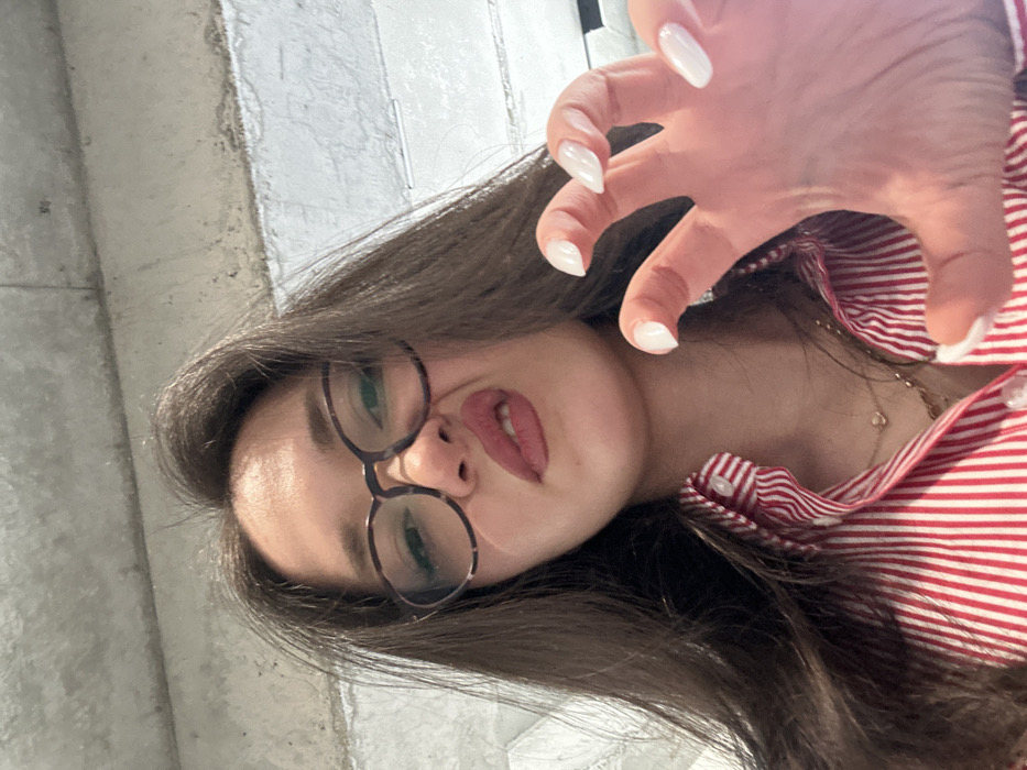 This image depicts a close-up, low-angle shot of a single female individual in an indoor location in Zovuni, Armenia. The background features a textured, light-colored surface, possibly concrete. The subject is a young adult female with long, dark brown hair. She wears tortoise-shell rimmed eyeglasses. Her facial expression includes a scrunched nose and pursed lips, with her mouth slightly open. She is wearing a red and white vertical striped collared shirt, unbuttoned slightly at the top, revealing a delicate gold-colored necklace with a small circular pendant. Her right hand is raised towards the camera, with fingers curled in a claw-like gesture. Her fingernails are neatly painted with a solid white polish. The overall impression is direct engagement with the camera.