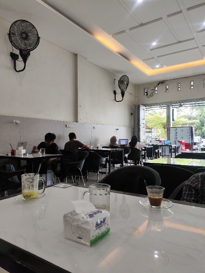Inside a brightly lit cafe, several patrons work on laptops at tables. Wall-mounted fans provide circulation. A table in the foreground displays used drinkware and a box of tissues. The cafe features an open facade with a view of the outdoors, where trees and other businesses are visible. The interior decor is simple and modern.