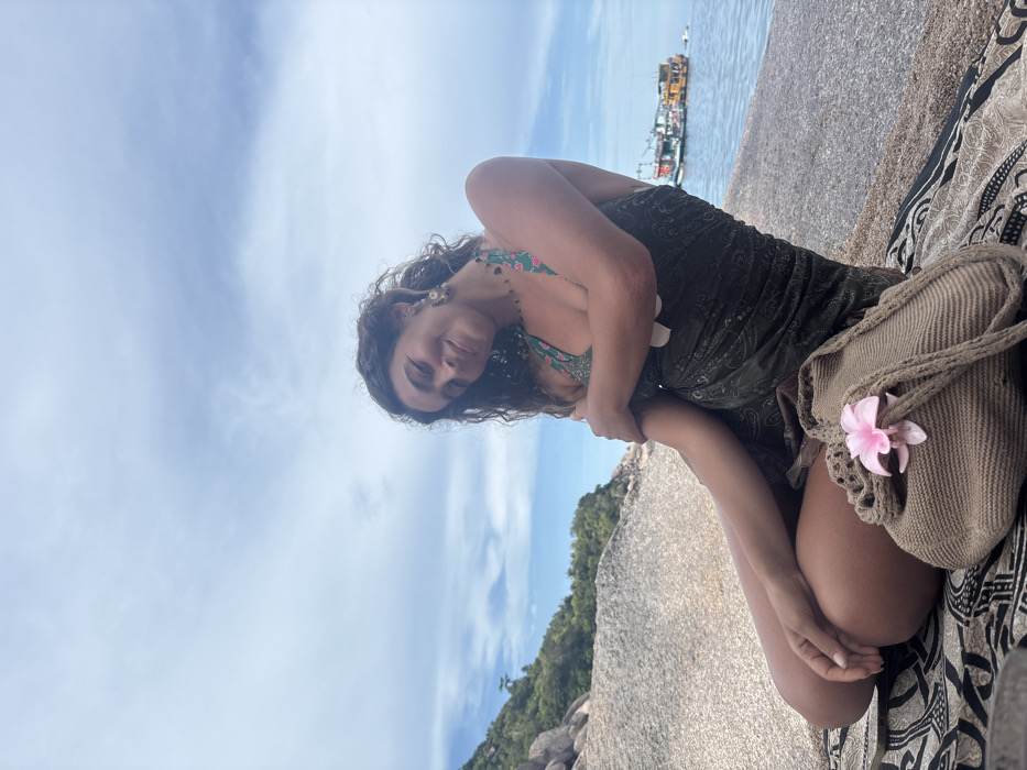 - "A female subject with long, dark, curly hair is seated on a patterned fabric spread over light-colored rocks at a coastal location in ตำบล เกาะเต่า, Thailand" by FM-wUaYc2, licensed under CC BY 4.0