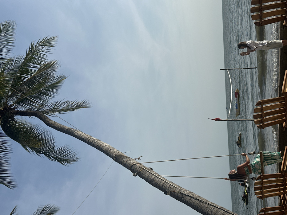 The scene depicts a sunny beach environment in Thành phố Phan Thiết, Vietnam. A large, curved palm tree originates from the lower-left corner and extends diagonally upwards across the left side of the frame. A swing with a wooden seat and two ropes is suspended from the trunk of this palm tree. A woman with dark hair, dressed in a green and white patterned two-piece outfit (crop top and wide-leg pants), is seated on the swing, facing right and looking upward with her head tilted back. Several wooden Adirondack-style beach chairs are visible in the lower foreground, positioned on the sand facing the water. To the right, another woman with dark hair, wearing a light-colored long-sleeved top and light-colored shorts, stands facing the ocean, holding a white smartphone horizontally as if taking a photograph. The ocean occupies the midground and background, with small waves breaking near the shore. Multiple jet skis are visible floating in the water on the left and center. A volleyball net is set up on poles in the shallow ocean water towards the right, and a red flag on a pole stands to its left. The sky is clear and light blue.