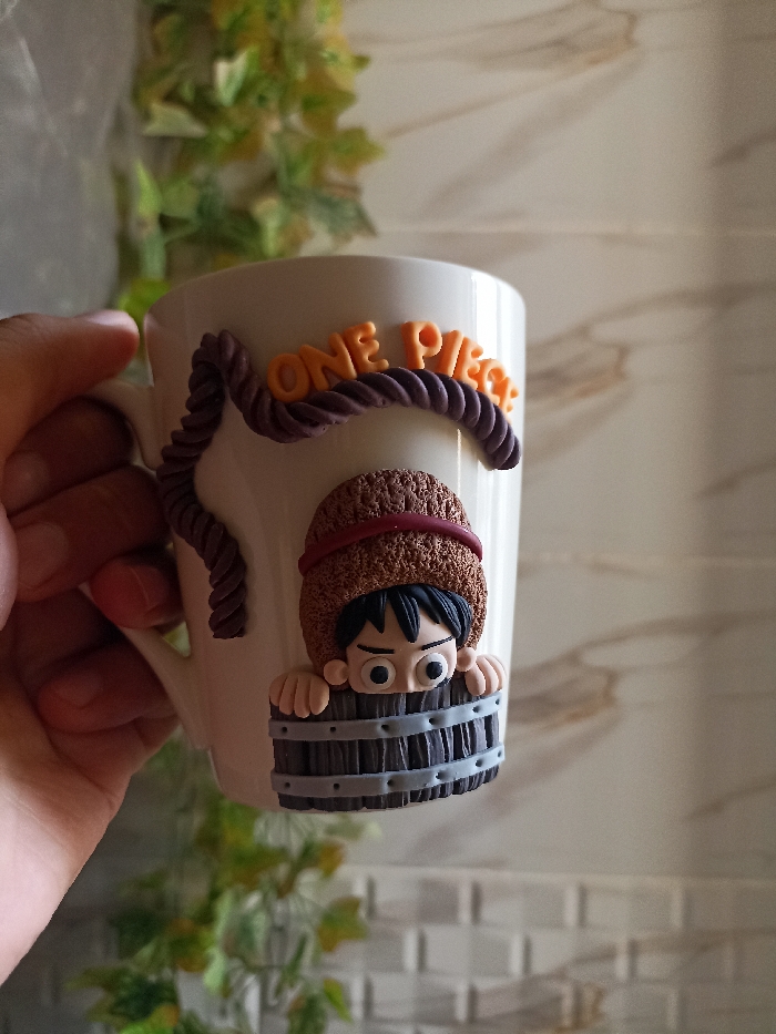 A light-skinned hand holds a white ceramic mug, decorated with 3D polymer clay elements, in what appears to be an indoor setting in Mu'adammiyat ash-Sham, Syria. The mug features a depiction of Monkey D. Luffy from *One Piece*, emerging from a dark brown barrel with gray bands. Luffy has black hair, large white eyes, and a textured, dark reddish-brown hat with a red brim. His small, peach-colored hands grasp the barrel's rim. Above the character, the words "ONE PIECE" are spelled in raised orange letters, beneath a dark brown, twisted rope-like element that wraps around the mug. The background consists of a blurred, light-colored tiled wall with a rectangular brick pattern on the right, and out-of-focus green artificial foliage on the upper left.