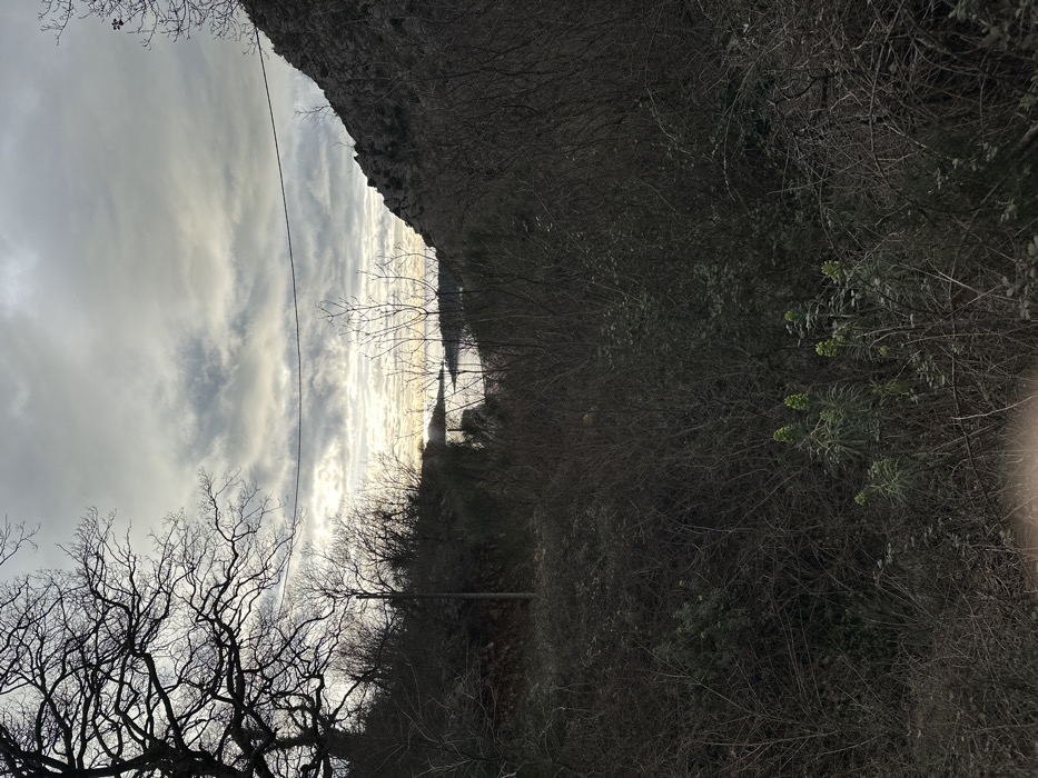 This image depicts a natural landscape in Čučuci, Montenegro, under an overcast sky with a bright horizon