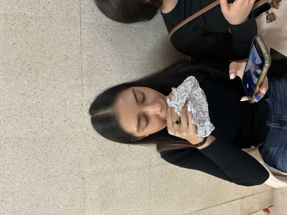 The image captures two individuals seated in an indoor public space, distinguished by a light-colored, speckled terrazzo-like wall with a horizontal grout line. The specific location within Madrid, Spain, is not ascertainable from the visual evidence provided. A young female, with long, dark hair parted centrally, occupies the left side of the frame. She wears a black long-sleeved ribbed top and blue jeans. Her left ring finger displays a dark ring with a four-leaf clover motif. Her fingernails are painted white, with the exception of her right thumb, which features blue polish. She is actively eating a food item wrapped in crinkled aluminum foil, holding it with both hands near her mouth, with her eyes closed or looking down. Simultaneously, she holds a smartphone in her left hand, which displays an illuminated screen. To her right, a second individual is partially visible, showing their right shoulder and a segment of their torso. This person has short, dark hair and wears a black top, with a brown-strapped bag visible over their shoulder. Both individuals appear to be seated side-by-side, potentially on a bench, against the patterned wall.