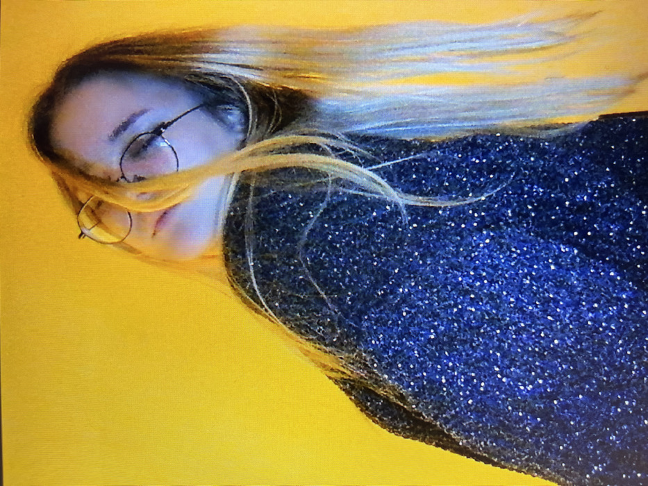 A person is depicted against a yellow background, lying on their side. They wear round glasses and a shimmering, dark blue sequin top. Their long, blonde hair cascades across the upper portion of the image, partially obscuring their face. The person appears to be in a relaxed or posed position, with a calm expression visible.
