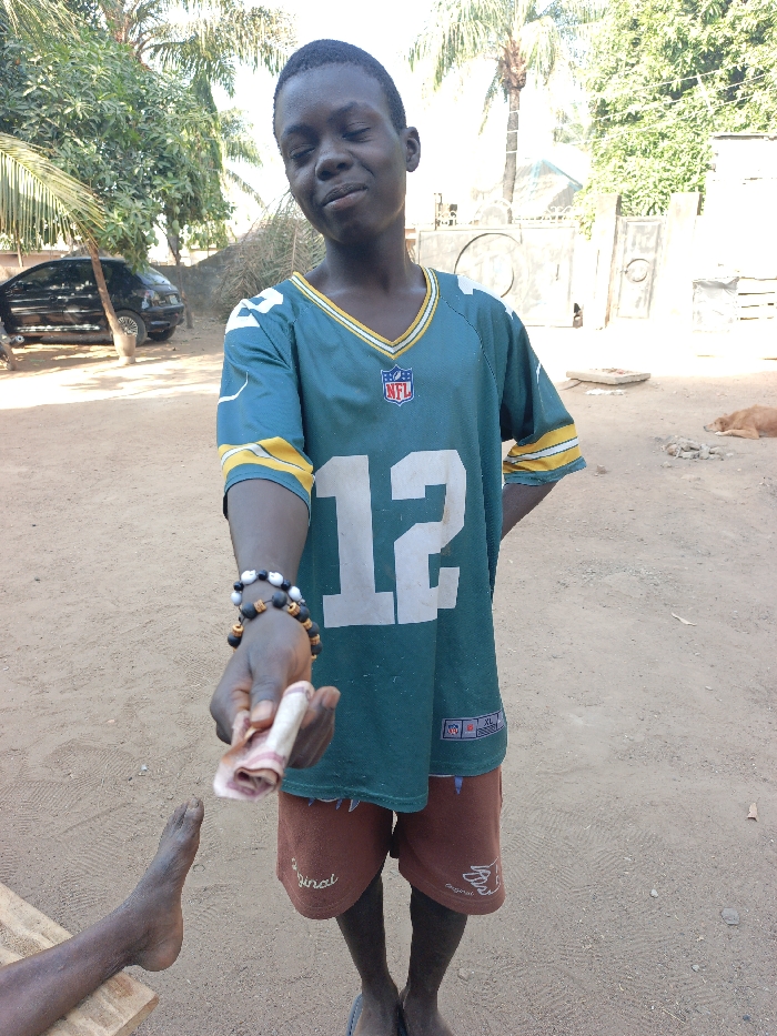 The image depicts an outdoor scene in Akwanga, Nigeria. A young dark-skinned male, positioned centrally, wears a teal American football jersey with the "NFL" logo and white number "12," reddish-brown shorts, and dark flip-flops. He has two beaded bracelets on his left wrist and is extending his left arm forward, holding a rolled bundle of currency notes. His facial expression shows a slight smile with partially closed eyes. In the lower-left foreground, a bare dark-skinned foot rests on a wooden plank, positioned to receive the notes. The ground consists of reddish-brown dirt. In the background to the left, a dark-colored car is partially visible behind green foliage and palm trees. To the right, a light brown dog lies on the ground, and behind it, a concrete fence or wall and a metal gate with circular decorative elements are visible amidst further vegetation, including palm trees. The scene is brightly illuminated by natural sunlight.