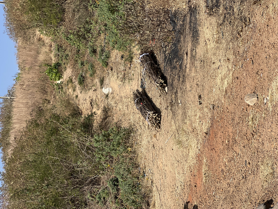 The image displays a sunlit, unpaved terrain, consistent with an undeveloped area within or on the outskirts of Jos, Nigeria. A dirt path ascends centrally through a landscape characterized by dry, reddish-brown soil, sparse light-brown vegetation, and scattered small rocks. Flanking the path are dense growths of green bushes and taller, dry golden grasses, with a utility pole visible in the distant upper background against a clear blue sky. In the foreground, two distinct bundles of cut wooden sticks lie parallel on the path. Each bundle is cylindrical, bound securely with white material, and features red markings on the bindings. A localized area of darkened, possibly burnt, earth is visible on the ground near the stick bundles. No persons or animals are present.