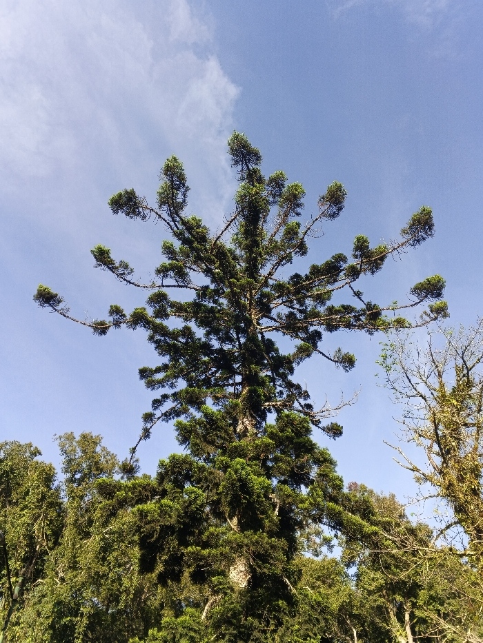 A tall Araucaria tree dominates the view against a bright blue sky with wispy clouds