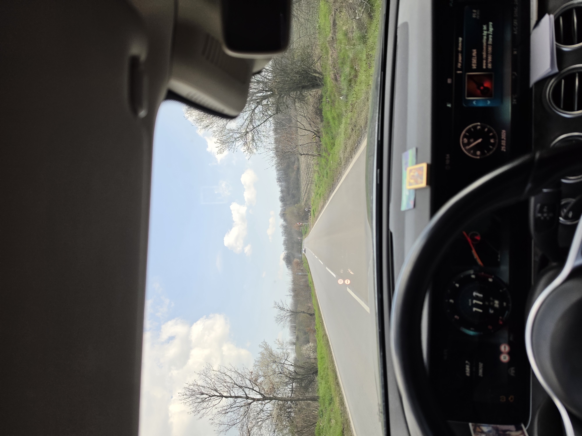 A forensic examination of the image reveals a first-person perspective from within a vehicle, looking forward onto a rural two-lane asphalt road in Bulgaria, identified as being in the vicinity of Dobrich. The upper portion of the image shows the vehicle's dark headliner, while the lower portion displays the driver's dashboard, steering wheel, and digital screens. The digital instrument cluster prominently features a numerical reading '777' within its central circular gauge, alongside other vehicle data and warning lights. The infotainment screen displays 10:54 as the time, 25.03.2024 as the date, and "Veselina" radio, with contact information for Stara Zagora. A small religious icon is positioned on the dashboard, and folded papers are near the passenger-side air vent. The road, marked by white solid and dashed lines and reflective studs, recedes into the distance under a partly cloudy blue sky. A white sedan is visible ahead, traveling in the same direction. The road shoulders feature green grass, bare deciduous trees, and trees with white blossoms, characteristic of spring. Tilled agricultural fields with visible furrows extend rightward towards a distant treeline. Road signs include a white rectangular sign on the left, and a partially visible inverted red triangle (yield) and a circular red prohibition sign on the right. A '50' speed limit icon is reflected on the windshield, likely from a heads-up display. No individuals are visible; the scene suggests a vehicle in motion with an unseen operator.
