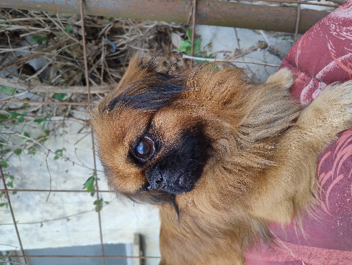 A small, brachycephalic dog, appearing to be a Pekingese or similar breed, is depicted lying on a patterned red and white fabric surface. The dog features predominantly tan to reddish-brown fur, a distinct black muzzle, and dark eyes. Its head is turned to its left, away from the viewer. In the background, a metal wire fence is visible, with sparse green foliage and bare branches intertwined. To the left, a light-colored concrete or stucco wall with a window element is partially visible. A vertical rusted metal pole stands on the right side of the background. The scene is located in Dolno Linevo, Bulgaria.