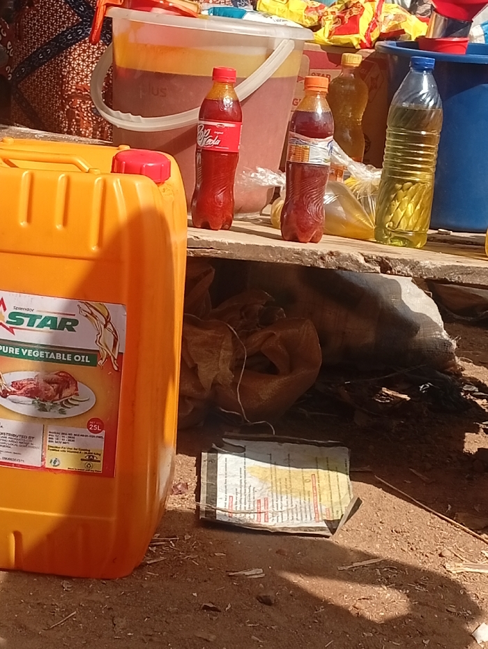 An outdoor market stall, exact city and country unknown, displays various cooking oils and provisions