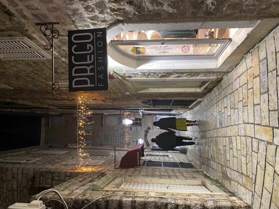 An outdoor stone alley at night features two people walking away. String lights hang across the passage. A "PREGO FASHION" sign is affixed to a nearby building. A shop window is visible in the background. The architecture is old and stone, with various windows and awnings along the alley. The cobblestone path appears wet or recently cleaned, reflecting light.
