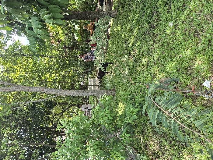 A lush outdoor scene features a variety of trees and dense ground vegetation. In the distance, people are visible, some seated on a bench or structure. A black and white animal, possibly a dog or cow, stands near the edge of the grassy area. A tree trunk dominates the middle ground, and a fern frond lies diagonally across the right foreground. The overall impression is one of a park or natural setting with people enjoying the outdoors.