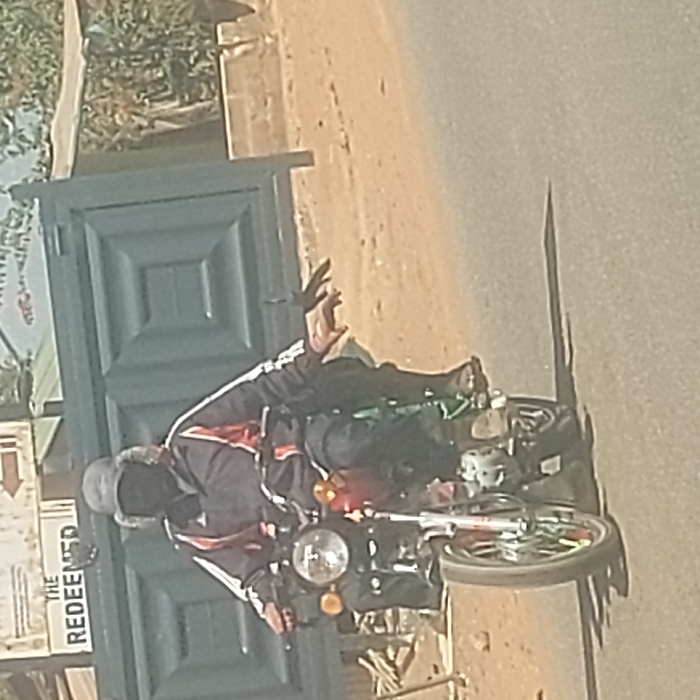 A single individual is observed operating a motorcycle on a paved road, adjacent to a dirt shoulder, in Kuru Dungus, Nigeria. The rider wears a dark jacket with prominent white and red stripes on the sleeves, a grey cap with ear flaps, dark trousers, and dark open-toed sandals. Their face is obscured by a dark covering. The motorcycle features a chrome front fender, round headlight, amber turn signals, a visible red section consistent with a fuel tank, and a front wheel with spokes and multi-colored rim accents (green, red, yellow). The rider's left hand appears to be on the handlebar grip, while the right arm is fully extended horizontally to the side, away from the motorcycle, with the hand open, fingers slightly splayed, and palm facing downwards. In the background, a large, dark-colored metal gate with square panel designs is visible, partially obscured by a sign reading "THE REDEEMED" with a right-pointing arrow. Further right, foliage and a light-colored brick wall section are present. The scene is illuminated by daylight, casting shadows on the road surface.