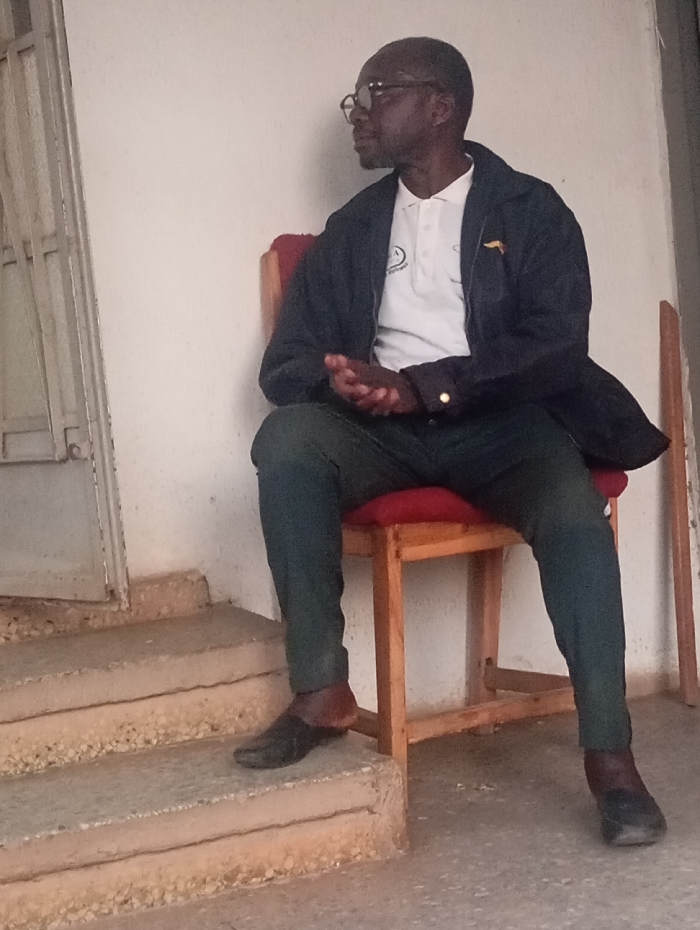 A slim, dark-skinned man with glasses sits on a red-cushioned wooden chair next to concrete steps leading to a white wall with a partially visible door. He wears a white polo shirt under a dark jacket, green pants, and black loafers. His hands are clasped in his lap, and he gazes towards the left. The setting appears to be outdoors, near a building.