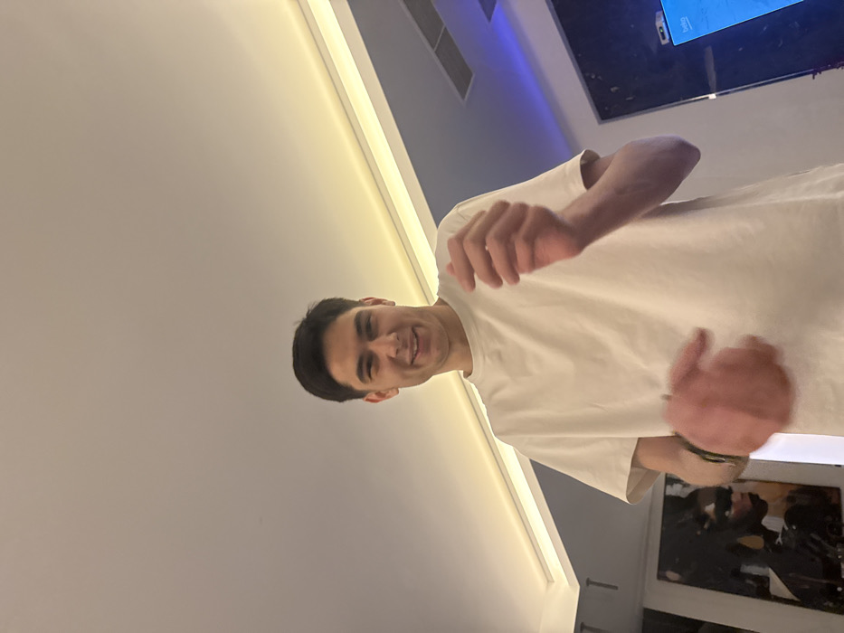 The scene depicts a young adult male, located indoors in the city of Sofia, Bulgaria. The subject has dark hair and is wearing a plain white short-sleeved t-shirt. He is captured looking directly at the camera with a smiling facial expression, his hands raised and in motion, with the left hand exhibiting noticeable motion blur. A dark bracelet is visible on his left wrist. The immediate environment features a white ceiling equipped with warm, yellow-toned strip LED cove lighting. To the left, a dark grey wall is partially visible, displaying two framed artworks; the left artwork appears to be a dark abstract or stylized portrait. To the right, a large, reflective dark screen, identified as a television or monitor, is visible, partially displaying a blue interface and a "Beko" brand logo on its lower right side. Cooler blue ambient light emanates from the right side of the room, contrasting with the ceiling's warm lighting. A white rectangular air vent is mounted on the ceiling in the upper right quadrant.