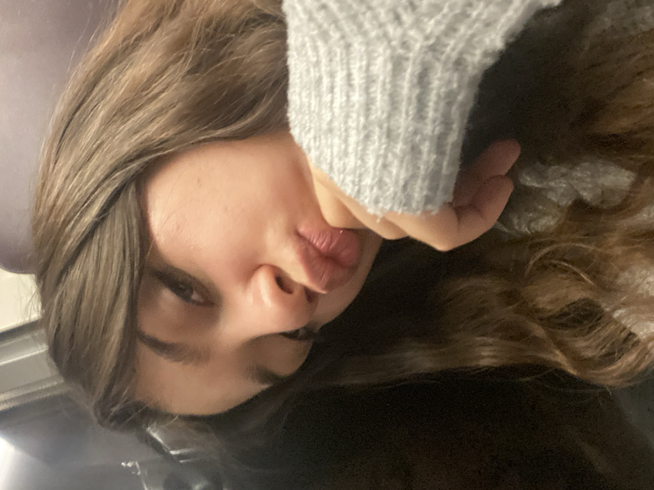 This image depicts a close-up, angled selfie of a female individual, located in an unspecified indoor setting within Hochfelden, France