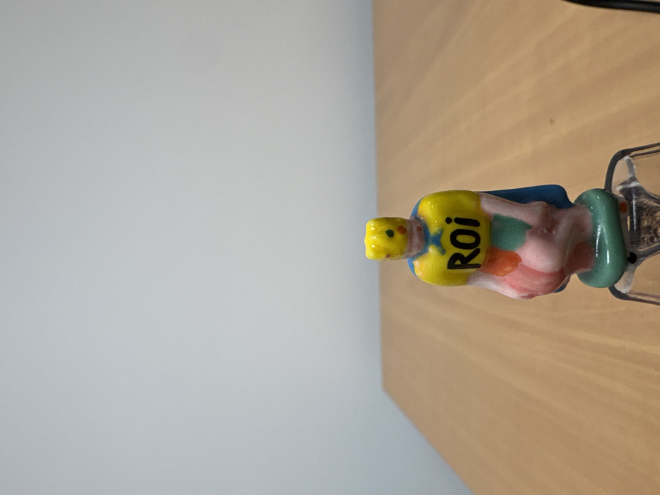A ceramic, novelty salt shaker resembling a soccer player rests on a wooden surface. The figure is positioned horizontally with a yellow shirt displaying "Roi" in black letters. Its pants feature a blend of green, pink, and orange hues. The player has a yellow head and a blue cape. A green ring shapes the figure's base, likely serving as the shaker's dispensing point. The salt shaker's clear plastic stopper is visible. The background is divided between a white wall on the left and the wooden surface on the right.