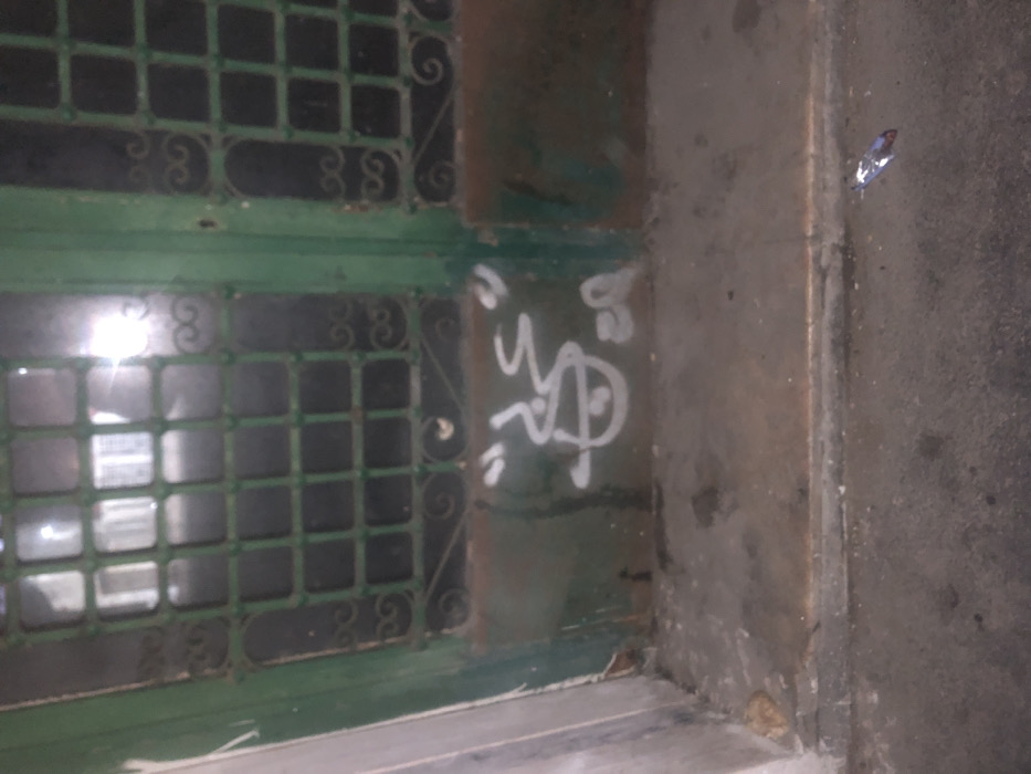 This image captures a ground-level view of a weathered dark green double door in an urban environment in Casablanca, Morocco. The upper sections of the door feature glass panes protected by dark metal security grids, characterized by square patterns and decorative scrollwork at their bases. The green paint on the door's lower solid panels is significantly worn, rusted, and discolored. White spray paint graffiti, resembling stylized Arabic script or a tag, is centrally applied to the lower left door panel. The immediate foreground consists of a grey, stained concrete or stone ground surface, with a raised threshold running horizontally at the base of the door. A small, crumpled piece of metallic litter is visible on the ground in the lower right. A light-colored concrete wall segment is present on the far left.