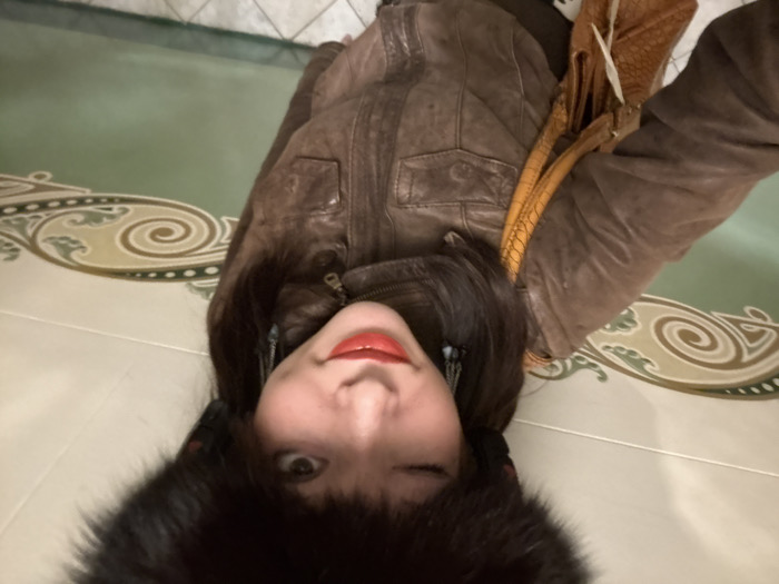 A woman with red lipstick winks, wearing a brown leather jacket and a furry black hat. A brown purse hangs over her shoulder. The background features a light-colored tiled floor with a decorative border pattern in tan and green. The photo is taken at an unusual angle, making the floor appear as a wall behind her.