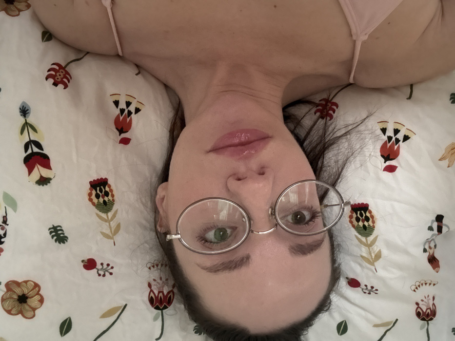 A woman with pale skin and dark hair lies upside down on a bed with a patterned white sheet. She wears round silver glasses and a light pink top with thin straps. Her eyes are green and hazel. Her lips are glossy.