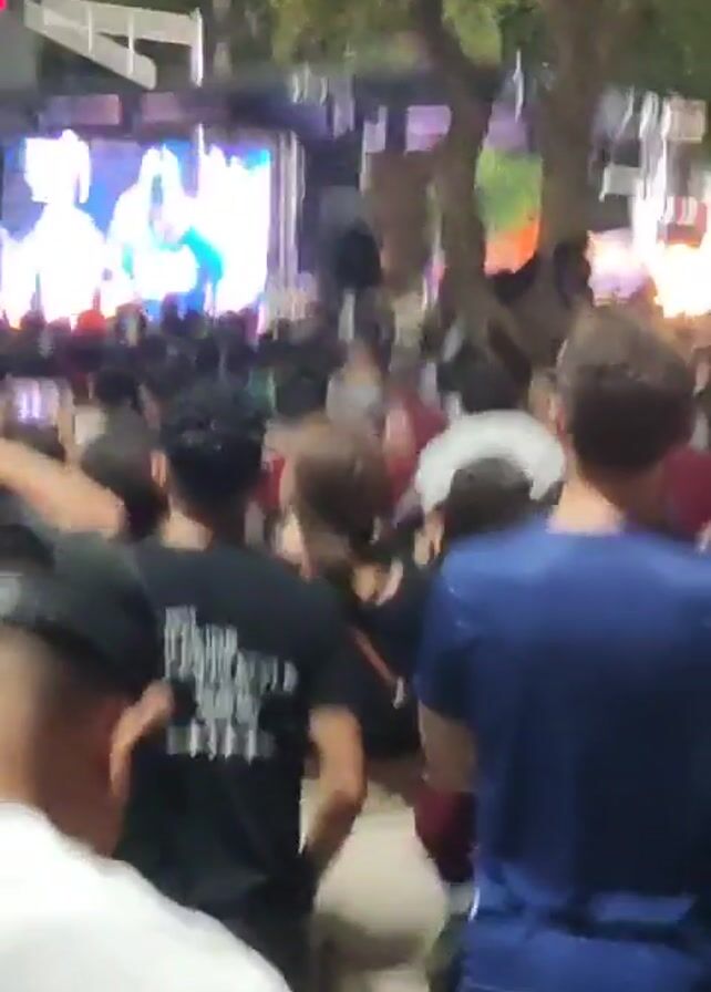 A medium shot shows a large crowd of people in front of an outdoor stage. The stage features a bright screen displaying video, and its supporting structure is decorated with white lights. The crowd is dense, with people packed close together. The majority of them face the stage, and some are holding their hands up in the air. Trees are visible behind the stage and to the sides. The people in the crowd are dressed in casual clothing and are diverse in appearance. The video appears to be shot from within the crowd, giving a sense of immersion in the event.