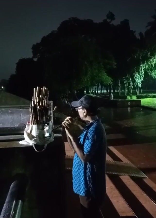 A man in a blue patterned shirt and a cap stands at the edge of a fountain in a dark park. He appears to be holding something to his mouth, possibly smoking or playing a small instrument. Beside him on a ledge is a container filled with sticks. In the background, two people walk past the fountain. The scene is illuminated by spotlights.