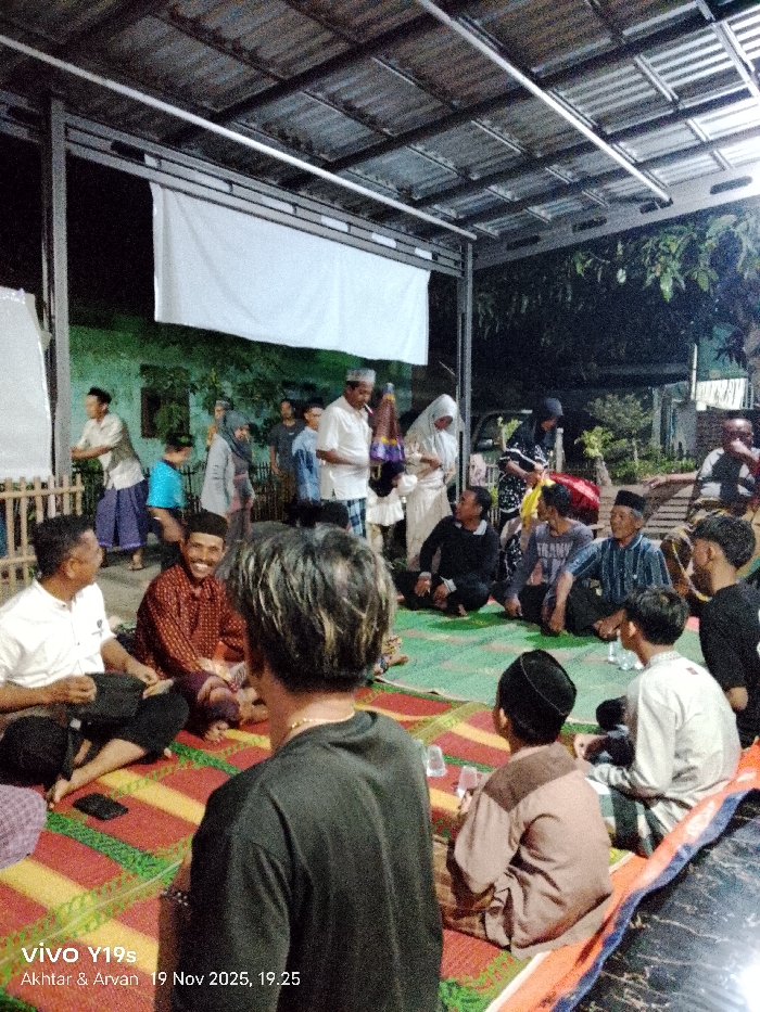This image depicts an evening communal gathering in Wanguk, Indonesia, occurring under a covered, open-sided structure with a corrugated metal roof supported by metal pillars
