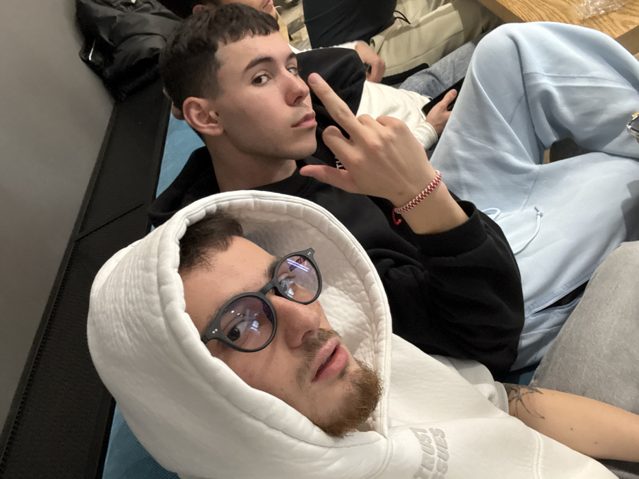 The image displays three individuals seated indoors, located in Varna, Bulgaria. In the left foreground, a male subject with short dark hair and light facial hair is wearing a white hooded sweatshirt with the hood up. He wears dark-framed round glasses, which exhibit reflections of a light source or screen. The text "TRUST ISSUES" is partially visible on the left sleeve of his sweatshirt, and a tattoo is present on his left forearm. He is gazing directly towards the camera. Adjacent to him on the right, a second male subject with short dark hair and bangs is seated, dressed in a black long-sleeved shirt and light blue sweatpants. A red and white braided bracelet is visible on his left wrist. His left hand is raised, with the index and middle fingers extended in a "V" sign towards the camera. He also looks directly at the camera. A third individual, partially visible in the far right background, wears a striped shirt. The subjects are positioned on a light blue upholstered seating surface. The background is dark and indistinct.