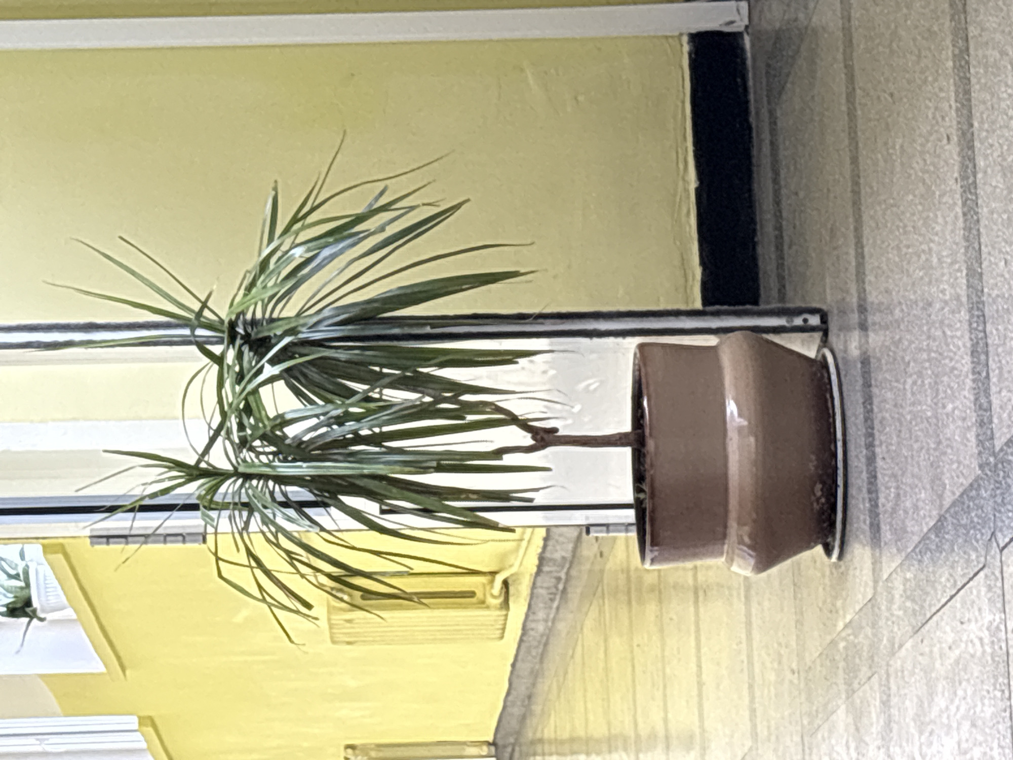 An indoor scene in Varna, Bulgaria, depicts a single potted plant positioned on a tiled floor. The plant, identifiable as a Dracaena, features multiple stems adorned with long, narrow, dark green leaves. It is contained within a two-tiered brown ceramic pot that rests on a white circular saucer. The floor surface is composed of light grey tiles with darker grey linear patterns. The surrounding walls are painted a uniform bright yellow, complemented by a dark grey baseboard at the floor level. To the left of the plant, a white horizontal radiator is mounted on the yellow wall. A white vertical architectural element, possibly a doorframe, is situated directly behind and partially to the right of the plant. Further down the hallway, an additional white potted plant is visible on a distant elevated surface. No individuals or active subjects are present.