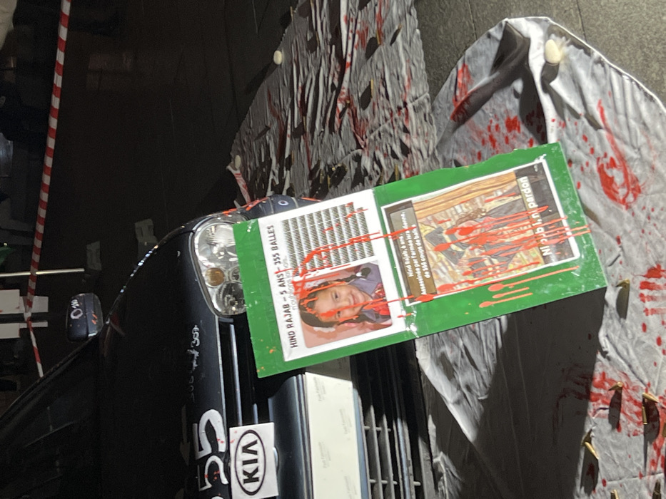 The image depicts a static outdoor display or protest installation, illuminated at night or in low light, set up in front of the Cathédrale Notre-Dame de Strasbourg, France. The front portion of a dark-colored Volkswagen Golf (Mk4 generation) is positioned on the left side of the frame. A "KIA" logo sticker is affixed to the front grille, and the number "55" is visible in white on the hood. The passenger side mirror displays the numerical inscription "020." The vehicle's front fascia and hood are splattered with red liquid, simulating blood. In front of the vehicle stands a green, two-panel sign, heavily splattered and streaked with the same red liquid. The top panel features a photograph of a smiling young girl with accompanying text: "HIND RAJAB - 5 ANS - 355 BALLES" and columns of small, dark graphical elements resembling bullet casings. The bottom panel displays a multi-figured illustrative image, also splattered with red liquid, with the text "Ni oubli, ni pardon" (Neither forgotten, nor forgiven) at its base. A light-colored tarp, extensively stained and splattered with red liquid, covers the ground in front of the car and the sign. Numerous metallic, spent bullet casings are scattered across the tarp, particularly in the foreground. Several small, white, circular objects are also visible on the tarp. The background is dark and out of focus, revealing a red and white striped barrier tape stretching horizontally, and a vertical green pole or banner in the upper left. No individuals are present or actively engaged in the scene.