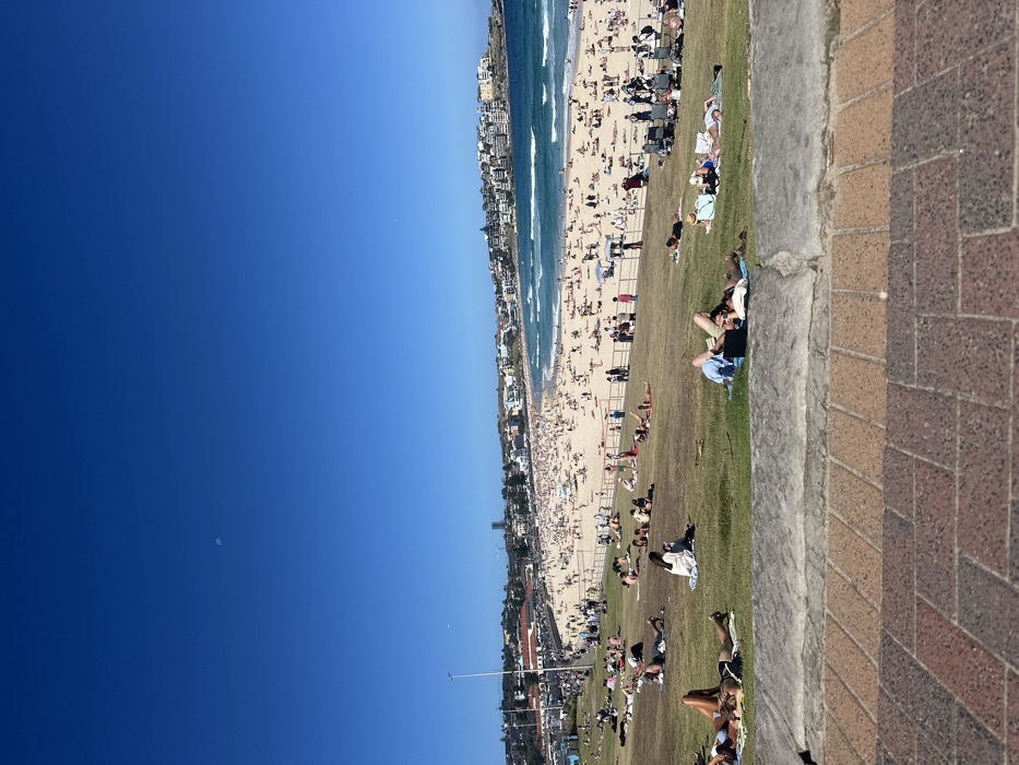 A sunny beach scene shows a crowded shoreline and ocean waves. People relax on the sand and grassy area. A brick wall runs along the edge. The sky is a clear, deep blue. Buildings line the coast behind the beach.